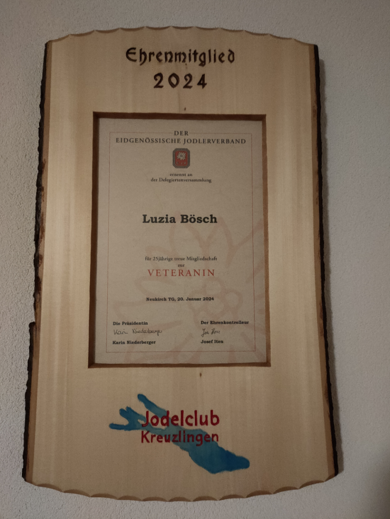 Am 20. Januar 2024 durfte unsere Dirigentin Luzia Bösch die Veteranenehrung für 25 Jahre Mitgliedschaft im NOSJV entgegennehmen. Die Chorgemeinschaft vom Jodelclub Kreuzlingen und dem Jodlerklub Weinfelden sangen zu Ehren ihrer Dirigentin das Lied "Chüejerglüt" von Hannes Fuhrer.